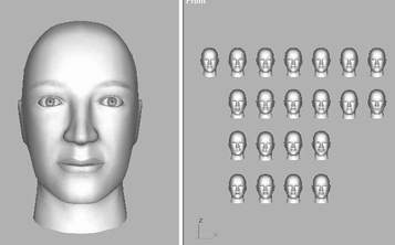 另外,利用一些专门的第三方插件会更加的方便快捷。例如:JetaReyes、FaceStation结合Bones制作对口型高级表情动画也是效果不错的。这些表情插件的实现原理和前文介绍的是一样的,都是好多典型表情模型之间的自动渐变(请看图2,就是很有说明意义的)。其中FaceStation是笔者所用的插件中最欣赏的一个,具有一些3DS MAX 5本身所没有的优点,如此直观的制作环境是不是很吸引人呢:)