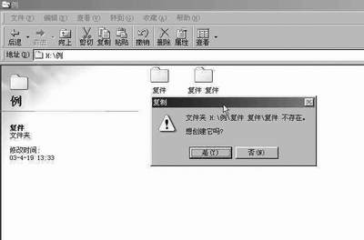例如建立一个名称叫“工作”的文件夹,在里面有两个文本文件1.txt和2.txt。现在复制工作这个文件夹,然后立刻选择粘贴,这样就会在该目录下生成一个“复件 工作”的文件夹。并且内容完全相同。这些都是正常的,但是如果你要复制的这个文件夹名称为“复件”时,问题就出来了(但有一个前提,就是文件夹内要有文件),当你选择好复制后,再选择粘贴时就会跳出一个对话框(图1)。