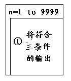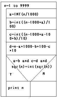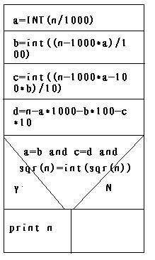 通过上面对条件和结果的分析,处理过程也就明确了,我们让电脑做的工作是什么呢?实质上就是将n定在0001~9999的范围之间,我们将n分成4个数位,a,b,c,d,将符合 a=b,c=d且sqr(n)=int(sqr(n))的数找出来。因为数非常多,并且特点相似,所以要用到循环(如图5),循环多少次呢,1-9999,9999次。