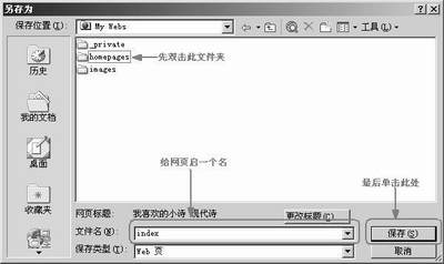 保存时要注意了,前面我们提到过为了以后的站点管理方便,我们将所有的网页文件保存到一个文件夹中,在此我们新建一个“homepages”文件夹,有一点特别要注意,在“文件名”后面的下拉列表中我们要将网页重新命名,而且必须用英文或汉语拼音作为页面文件的名称。在图4窗口中,系统默认给网页命名为“index.htm”,由于刚才创建的不是首页,所以我们不能用“index.htm”作为页面文件的名称,我们将它命名为“xiaoshixinshang.htm”,单击“保存”即可。