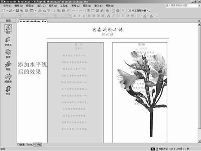 现在我们要在标题下加一条横线。将鼠标光标定位到要添加水平线的位置,然后单击“插入”菜单中的“水平线”命令,单击FP窗口的左下角的“预览”,即可以看到效果了(图9)。最后记住将它保存起来。