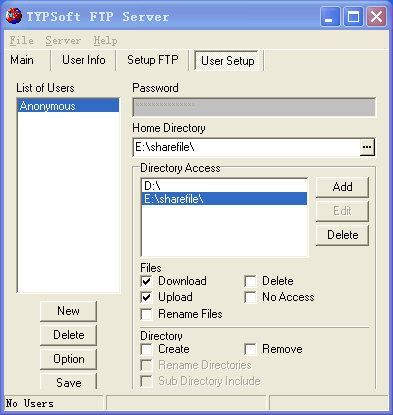 接下来运行解压出来的Ftpserver.exe,此时系统的托盘区内会出现相应图标,点击一下就可以在对话框中进行个性化配置了。服务器缺省设置是把计算机上的整个D盘都共享,当然你也可以把它改为想要共享的其他磁盘分区或目录。点击对话框中的User Setup(图1),再点击Anonymous(此时允许对方匿名访问本FTP服务器),把原来的D:\改成其他的路径(点“...”按钮)和目录,如E:\sharefile,再按Add按钮并重新确认一遍将它添加进来。然后在“Directory Access”框中选中新添加的路径,在下方勾选设置一下访问机器对本FTP服务器的访问权限(Download为可下载,Upload为可上传)。接着按Save保存起来,这样就OK啦。