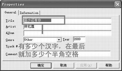 按顺序安装这三个软件,其中的三个运行SETUP2.EXE就可以了。之后在Rio Music Manager的Properties中编辑歌名就可以了(如图5)。有一点必须注意,歌名中有几个汉字就必须在最后加上几个空格,否则显示不全。注意:编辑之后的标签信息显示出乱码,但这不影响使用,别去管它。在播放器上中文顶部一行无法显示,比如“良”就变成了“艮”,据说用英文版Windows XP安装中文输入法就可以解决,大家可以试一试。