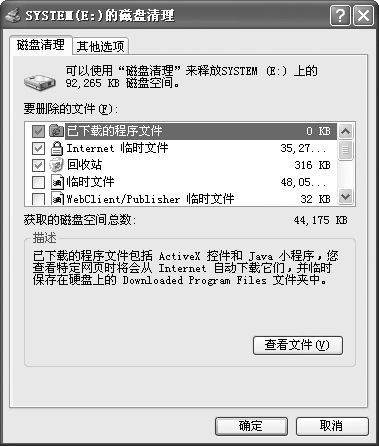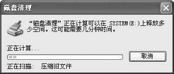 我们可以通过“开始→所有程序→附件→系统工具→磁盘清理”来打开磁盘清理工具,在出现的窗口中,通过下拉框来选择要清理的磁盘驱动器,比如E:盘(如图1所示),再单击“确定”按钮,这样磁盘清理程序将花一些时间来搜索出这个驱动器上的各种临时文件,以此来计算出可以释放的空间大小,并显示一个进程窗口(如图2所示)。
