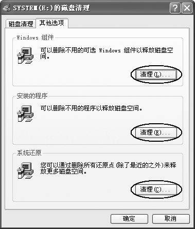 另外,在“其他选项”标签选项卡中,我们可以通过相应的“清理”按钮来删除不用的Windows组件(比如我们不需要Windows自带的游戏)、已经安装的程序以及所有的用于系统还原的还原点,如图4所示。