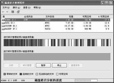 我们可以通过“开始→所有程序→附件→系统工具→磁盘碎片整理”来打开磁盘碎片整理程序主窗口,在该窗口中将列出你计算机中所有的磁盘驱动器及其文件系统、容量使用状态等信息(其中的“%可用空间”=可用空间/容量)。选择某个要整理的磁盘驱动器,比如C:,再单击窗口左下方的“分析”按钮就可以对磁盘进行分析,接着将在“进行碎片整理前预计磁盘使用量”状态栏中以不同颜色的柱状条来表示不同文件在该磁盘中的分布,比如红色的表示碎片文件,白色的表示可用空间,在主窗口的最下方还会显示分析的进度,如图5所示。