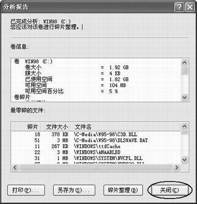在一段时间之后,会弹出一个提示窗口,单击“查看报告”按钮可以看到各种碎片的详细信息,如图6所示。单击“关闭”按钮会回到主窗口。