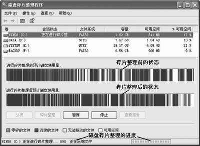 由于经常在磁盘上添加/删除应用程序,或者来回移动文件(或文件夹),这样会使同一文件的各个部分分散存储在磁盘的不同区域,而造成数据存储的混乱。这样时间一长,会降低对磁盘的访问速度,从而影响系统的整体运行速度。不过通过Windows提供的“磁盘碎片整理”可以解决这一问题。通过该工具可以将磁盘碎片文件(或文件夹)合并在一起,连续地存储起来,以此来加快数据的读取速度。