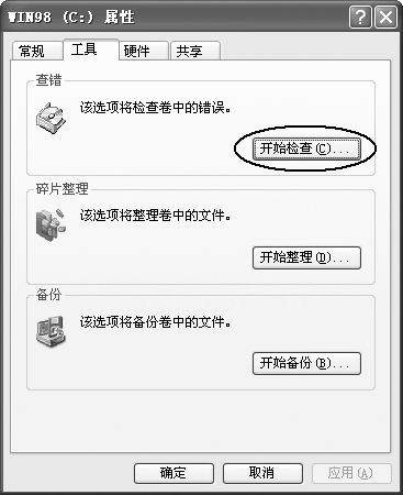 在该窗口中,单击查错下的“开始检查”按钮,就可以打开磁盘检查的选项窗口,其中我们可以选择“自动修复文件系统错误”或“扫描并试图恢复坏扇区”项,在单击“开始”按钮之后,Windows XP就可以对C:盘中的文件系统进行检查并排除错误,或者对磁盘进行扫描,如果发现坏扇区再进行修复。在检查结束后,会弹出一个“已完成磁盘检查”提示窗口。