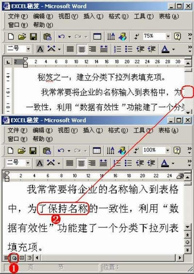 ②单击“前一页”按钮,文档向上翻一页(处于第“2页”),并将光标定在该页第一行行首。