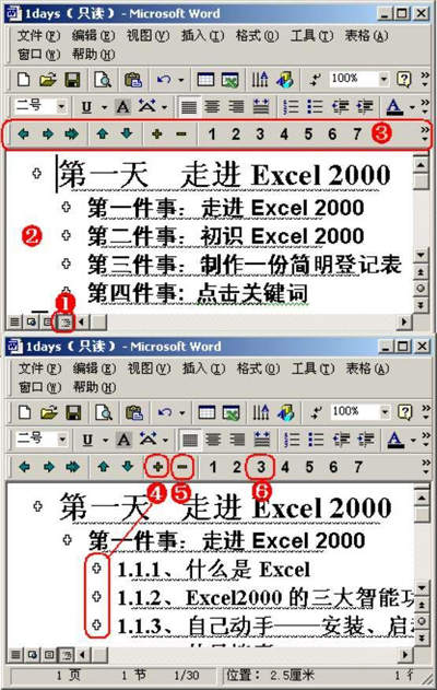 ⑤单击“-”按钮,可以逐级收拢文档,方便查看文档的整个构架。
