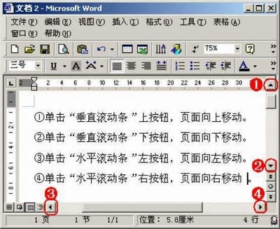 ①单击“垂直滚动条”上按钮,滚动条向上移动,浏览文档前面的内容。