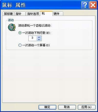 在默认的情况下,滚轮每滚动一个齿格(滚动的最小单位)可滚动三行。我们可以根据自己的需要,将滚动的行数进行调整或者设置为每次滚动一屏。设置方法是:在“控制面板”上,双击“鼠标”图标,打开“鼠标 属性”设置窗口。在其中单击“轮”选项,在“滚动滑轮一个齿格以滚动”下面有两个选项,分别是:①“一次滚动下列行数”,默认为3行,可以任意调整每次滚动的行数。②“一次滚动一个屏幕”,选中此项,每滚动滚轮一个齿格将滚动整个屏幕(如图)。