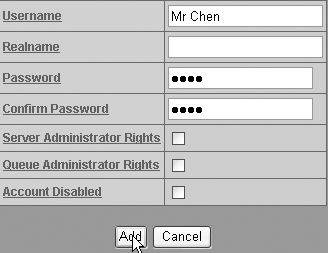 作为管理员登录以后,我们就可以点击“Add User”按钮,来进一步增加其他用户并为该用户设置相应的权限。下方两个Administrator选项决定该用户是否具有服务器的管理权限,可暂时不勾选,而“Account Disabled”(账号禁用)则不能勾选(图3)。