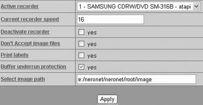 在这里,我们可以选择要提供共享服务的本地刻录机(Active recorder)、设定刻录机的速度(Current recorder speed)、是否禁用某台刻录机(Deactivate recorder)、是否收受镜像文件(Don't Accept image files)、是否印刷标签(Print labels,需要打印机支持)、是否启用缓冲欠载保护(Buffer underrun protection)以及指定镜像文件存放路径(Select image path)。完成后点击“Apply”按钮使设置生效。