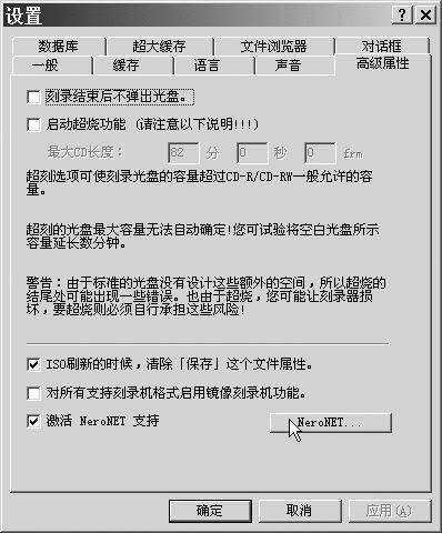 运行Nero Burning ROM,点击“文件→设置→高级属性”,在图5中勾选“激活NeroNET支持”。