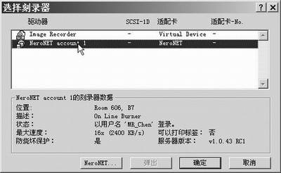 成功登录到网络刻录服务器后,我们就可以选择刻录机了。点击“刻录器→选择刻录器”,会在图7中显示出一个名为“NetNET”的刻录机。选择这个刻录机,在下方我们可以看到该刻录机的相关信息,点击“确定”按钮即可。