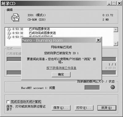 实现网络刻录就这么简单,美中不足的是目前NeroNET暂时还不支持DVD刻录,最大刻录容量为700MB,不过相信在以后的版本中,还会增加这些功能。