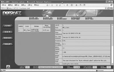 可以看到在客户端中,Nero会自动将要刻录的文件通过网络传输到服务器上并生成一个映像文件。此时我们再到服务器的“JOBS”看看,就会发现如图9所示的任务信息。