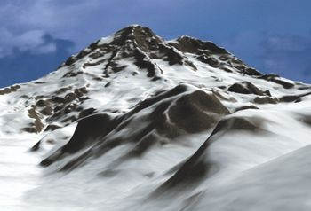 最后我们使用Top/Bottom材质来模拟一部分雪已经消融的雪山效果。选择一个空白材质球,点击Standard按钮,在弹出的窗口中选择Top/Bottom,将编辑好的雪材质拖到Top Material后面的按钮上,将编辑好的泥土材质拖到Bottom Material后面的按钮上,修改Blend为5,修改Position为90,Position参数用于控制雪所占的比例,如图4所示。大家可以根据不同的模型适当地调整这个参数,将编辑好的材质赋予山脉。