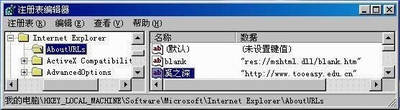比如:我可以把http://www.sina.com.cn改成“我的搜索”,要打开此网页只要在地址栏内输入“about:我的搜索”即可。如果你的朋友个人主页的网址很长,你可以也给它起个名字,比如把“http://www.tooeasy.edu.cn”改成他的名字“奚之深”。现在好了,你可以直接用“about:奚之深”,进入他的网站了。闲话少说,马上行动,在“运行”中输入regedit进入注册表编辑器,展开到:[HKEY_LOCAL_MACHINE\Software\Microsoft\Internet Explorer\AboutURLs]分支。你可以看到在AboutURLs下的子键blank对应着res://mshtml.dll/blank.htm,这就说明当你在地址栏内输入about:blank时,Windows会自动转换成res://mshtml.dll/blank.htm。现在你可以任意添加键值,如:在AboutURLs中加一个名为“奚之深”的键,键值改为“http://www.tooeasy.eud.cn”(图3)。你也尽可以一口气添加一批。好了,现在你可以与那些长长的网址说拜拜了!