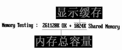 阿King提示:图中的内存是256MB的,为何显示出“261120K+1024K”的信息呢?其实这是由于整合显卡的缘故。如果你使用的是集成在主板上的显卡,这种显卡就会与主板共享内存。所以内存自检时显示的内容会和使用独立式显卡的主板有些区别。集成显卡的主板会显示“261120K+1024K Shared Memory”,其中1024KB是用于显示缓存的。
