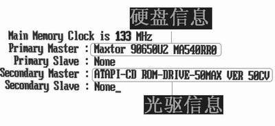 刚才第一幅画面显卡的信息一闪而过时,系统就直接进入第二幅面画。在这个画面里你将了解有关机器的主板、CPU、内存、硬盘等信息(图2)。