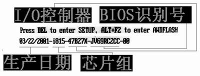 在屏幕的最下方有两行(图7),其中第一行是进入BIOS设置界面的启动键,一般情况下按Del键即可以进入BIOS设置程序。第二行,也是整个这个屏幕的最后一行,主要显示主板BIOS的详细信息,它主要包括主板BIOS的日期、BIOS的版本、主板生产厂商及主板所采用的芯片组等信息。例如,这里显示的“03/22/2001-i815-47B27X-JV69RC2CC-00”是主板的BIOS-ID。BIOS-ID一般由BIOS的生产日期(03/22/2001)、芯片组(北桥芯片)(i815)、I/O控制器(南桥芯片)(47B27X)、BIOS识别号(JV69RC2CC)及最后的两个“0”组成,这两个“0”一般没有什么固定的意义。