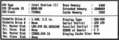 ④右下方──其他信息。首先右边第一项信息(Display Type)是表示显示器的显示模式(一般是VGA)。接下来是串口(Serial Ports)和并口(Parallel Ports)的地址,它们的地址一般都是固定的。下面的“SDRAM at Rows”是非常重要的,它表示主板上有几根内存插槽。如果你的主板有2根内存插槽,图中就会显示“0 1”,如果是3根就会显示“0 1 2”,依此类推。图中显示的是内存插在第2和第3根插槽上。