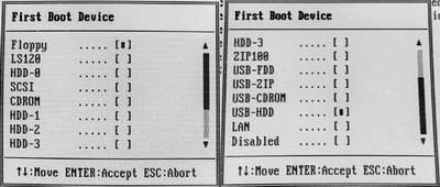 一台普通台式PC机,使用Award的BIOS,版本为6.00PG。在这台PC机上除安装了软驱、IDE硬盘、光驱等常见启动设备外,还配备有朗科的双启动优盘(USB接口)。我们来谈谈如何安排好这四种设备的启动顺序。假设欲设置的先后顺序是:朗科优盘→软盘→硬盘→光盘。首先将优盘设置为HD模式,并在Win98中利用“朗科双启动型优盘格式化工具”将优盘格式化为Win98启动盘,接下来将优盘插入USB接口,作好准备工作。