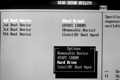 说明:由图3可见,这个版本的AMI BIOS程序将启动设备分成了4大类,并设置了优先顺序。图3所表明的启动顺序由先到后分别是:Hard Disk→ATAPI CDROM→Removable Devices→Intel(R) Boot Agen(网卡),系统启动时会按照这个顺序依次在各设备上寻找启动文件,如果一旦在其中的某个设备上找到启动文件,就会启动操作系统。需要注意的是,每一类Boot Device(启动设备)并不一定对应惟一的启动设备,如本例中的服务器安装了两套硬盘,因此还需在图3中的Hard Disk Drives子项中设置硬盘之间的优先顺序。