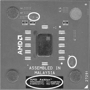 由于Thoroughbred B核心的Athlon处理器以其优异的超频性能受到广大DIYer们的追捧,因此最近听说有假冒的Athlon XP处理器在市场上出现,也就是有人将低主频的Athlon XP重新标成高主频的处理器来出售。下面我们便告诉大家一些鉴别真伪的方法,帮助大家识别假冒的Athlon XP处理器,注意图1中画圈的三个地方地方。从图2、图3来看,有些奸商通过断开一些L3、L12金桥来改变处理器的倍频,这样安装在主板上后,处理器就可以强制以更高的频率工作,当然超频也会造成一些潜在的不稳定因素,所以它们也会断开一些L11金桥来增加核心电压。在图2、3中划圈的部位便是被强制断开的金桥,与出厂时断开的金桥有很大不同,很明显是手动刻开的,边缘非常粗糙。另外还需要注意的是Athlon XP处理器的编号,假处理器的编号经过打磨,而且字迹模糊,一眼可以辨认出来,请大家在购买Athlon XP处理器的时候一定要小心,谨防上当!