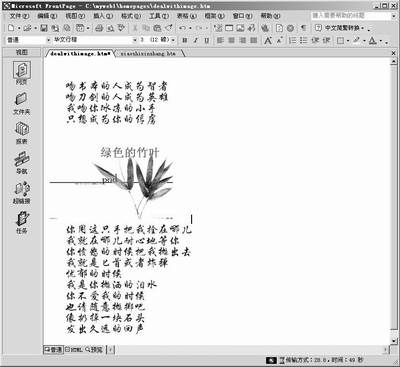 经常上网冲浪的朋友都会发现,几乎所有的网页都使用图片加以点缀,在网页中插入适当的图片,能够产生图文并茂的效果(由于图片处理工作是一项相对比较复杂的操作,处理图片有专门的工具来做,如Photoshop、Fireworks等,这些操作不属本系列文章论述的范围,请大家参见其他相关书籍资料)。上一期我们通过添加底纹图片间接地讲述了在网页中如何插入图片,本期我将带领大家实战图片操作,包括:①图片的插入②调整图片的大小和位置③编辑图片。Are you ready?下面我们就开始今天的旅程吧!