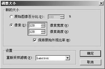 (5)点击工具栏的“颜色→真彩色(24位)”,再点击工具栏的“图像→调整大小”,把像素的宽度和高度设为128(图7);