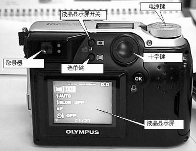 首先介绍的是液晶显示屏开关键,它控制LCD屏开关,第二个要介绍的是选单键,开机后单击该键可打开菜单进行各项拍摄(浏览)参数设置;第三个就是那个十字选择键,最后一个就是OK确定键了。