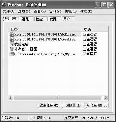“应用程序”选项卡显示计算机上正在运行的程序的状态,这也是我们最常用到的一项功能。在此选项卡中,我们能够结束、切换或者启动程序。