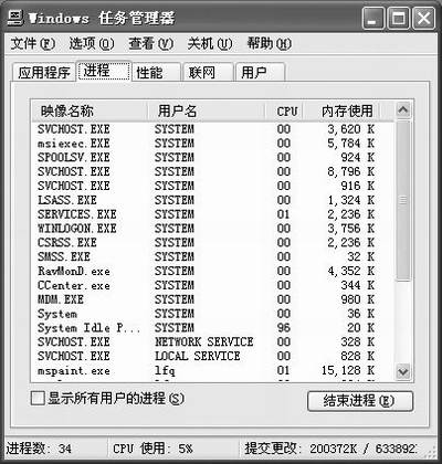 在Windows中,如果系统停止响应,这时候大家的第一反应就是使用组合键“Ctrl+Alt+Del”呼出“Windows任务管理器”。任务管理器可以提供正在计算机上运行的程序和进程的相关信息。图1就是WindowsXP任务管理器的窗口。在“任务管理器”中,一共有五个选项卡,让我们来为大家简单介绍一下。