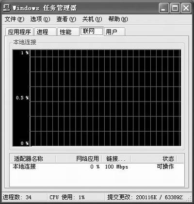 如图4所示,“网络”选项卡中,系统使用了图形的方式显示网络性能。它提供了简单、定性的图形,显示正在计算机上运行的网络的状态。只有当网卡存在时,才会显示“网络”选项卡。在该选项卡上,可以查看网络连接的质量和可用性。