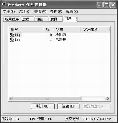 “用户”选项卡显示了访问该计算机的用户,以及会话的状态与名称。不过要注意的是,只有在你所用的计算机启用了“快速用户切换”功能,才出现“用户”选项卡。对于作为网络域成员的计算机,“用户”选项卡不可用,如图5所示。