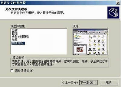 打开存有图片的文件夹,执行“查看→自定义文件夹”命令,在打开的“自定义文件夹向导”窗口中,选择文件夹的模板为“图像预览”(图1)。完成后你会发现文件夹的左侧出现了一行“以幻灯片显示方式查看图片”,点击其中的“幻灯片显示”,这时文件夹中的图片就像播放幻灯片那样一张张播放起来,在播放过程中你可以通过点击如图2所示的工具条上的按钮进行播放控制,也可以直接点击图片迅速换成下一张。