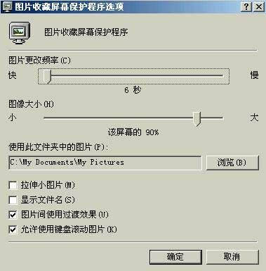 拖动“图片更改频率”下的滑块可以设置屏幕上转换图片的快慢;拖动“图像大小”下的滑块,可以设置图片占用屏幕空间的百分比;选中“图片间使用过渡效果”复选框,可在更换图片时采用动画效果等等。用这种方法即便没有图片浏览软件,也不影响大量图片的浏览。