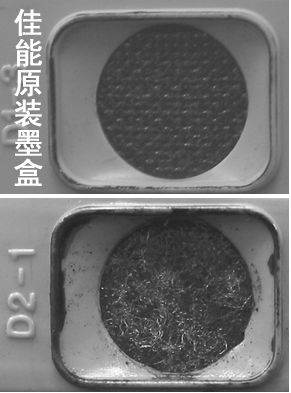 CANON原装墨盒(BCI-24 黑/彩)(图3)的色彩准确,纯正自然,用墨均匀,照片打印纸上ISO400样张的各物件光泽表现极佳,如餐具的金属光泽和反射,酒杯中酒的透明与反光,蔬菜叶卷曲处的反光,自行车木质座位的光泽等都有极好的体现。整体画面光亮清爽。在普通打印纸上表现不错,同照片纸相比只是在光泽度上有一定差异,而色彩差别不大,整体画面色彩和细节的表现都非常好。黑墨光亮,色彩纯正。而且CANON原装墨盒的储墨量很大,尤其是彩墨的容量远远大于部分品牌的兼容墨盒。而在安装CANON原装墨盒时,我们发现墨口遮挡橡胶非常干净,几乎没有任何墨迹,这与兼容墨盒墨口遮挡橡胶上清晰的墨迹形成了鲜明的对比(图2)。细看墨口,原来CANON原装墨盒在墨口处设有一层细密的网状物(其他品牌兼容墨盒未见有此设计)(图3),这使得墨水不容易漏出。