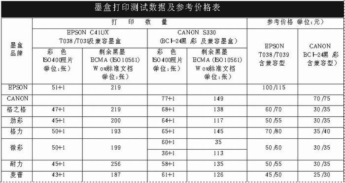 由于市面上兼容墨盒品牌过多,无法全部评测,所以我们采取了一定的筛选方式:我们选择了EPSON的STYLUS C41UX(市场参考价格:470元)和CANON的S330(市场参考价格:860元)两款打印机作为测试用机,它们所用墨盒的型号是T038/T039和BCI-24B/C,而并不是所有的兼容墨盒厂商都有这几种产品。这样一来,除了EPSON和CANON的原装墨盒外,我们在市面上找到6个品牌的兼容墨盒,它们是:格之格(G&G)、劲彩(JINCAI)、格力(GREE)、微彩(Microcolor)、耐力(NIKO)和麦普(MIPO)。