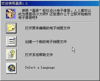 安装完成后,双击桌面上的程序图标,首先出现选择对话框(图1),由于是第一次使用,这里我们选择第二项“创建一个新的电子相册文件”进入《画易》的操作界面,这时在界面右侧会出现一个制作向导,它将引导我们完成相册的创建。