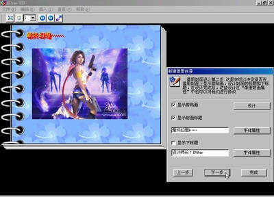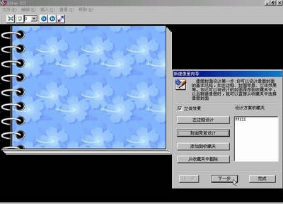 向导的第一步需要我们设计一下相册封面的基本外观,点选“立体效果”会让作品看起来更像是一本相册;左边框是指相册左侧的环扣,单击“左边框设计”按钮可以从预设的11种效果中挑选一种你喜欢的环扣样式;接着在“封面背景设计”中选择一幅淡蓝色的图案作为封面背景(图2)。然后单击“下一步”按钮。