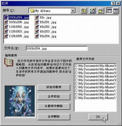 在完成页面中有“从指定的文件夹输入照片”和“开始编辑相册”两个单选项,我们在这里选择前一项。单击“完成”按钮关闭向导,在弹出的打开对话框中找到准备的图片素材,点击“全部添加”按钮把所有图片添加到打开列表中(图4),再单击“OK”按钮将图片导入相册。