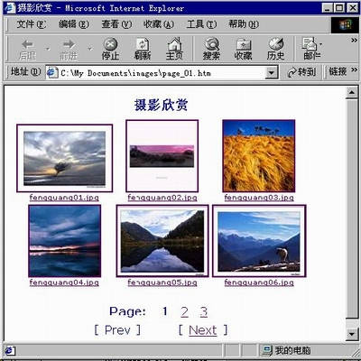 让我们来看看效果图(图3):怎么样?感觉还不错吧!最后提醒需要把这个网页发布到网上的朋友注意:除了上传这个HTML文件以外还要上传原图片文件和由ACDSee创建的缩略图图片(一般名称和格式都是TN_XXX.JPG,其中XXX为你的图片名称)到同一目录下面。