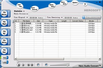 Hero Audio Convert的下载地址为http://www.heroshare.com/down/hac.exe。该软件能支持众多输入格式(包括WMA、MID、MP3、MP4、RM、AC3等多达20多种),在输出方面支持WAV、MP3、RA、WMA、DAC这5种,足够满足大多数玩家的需求了。软件的主界面如图1所示。