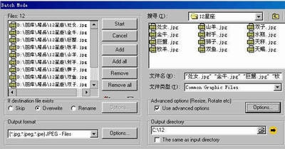 对于每天都要进行大量的图片处理的朋友来说,重复的工作无疑是一场噩梦。先进的批变换器Advanced Batch Converter(以下简称ABC)则可以很好地帮你的忙。它虽然体积小巧(1.96MB),却是一个有力的工具,可以很方便地批量调整图片大小,或者添加文本,色彩处理,使用滤镜等等,制作出大量的梦幻图片。下面以12星座图片为例,教你如何批量修改图片。