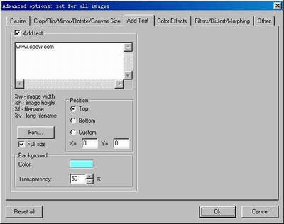 如果担心网站的图片被人滥用,可以为图片打上版权标记,这样即使被用,也为你的网站做了广告。点“Add Text”,(图2)同样勾选“Add Text”,在文本输入框中输入文字如:“www.cpcw.com”,点Font按钮设置一个漂亮的字体,在Background中可以设置文字框的背景色,在Trans Parency中设置背景的透明度。在Posion中的“X,Y”框中输入坐标,可以定义文本框在图片中出现的位置。得到图片(图3)。